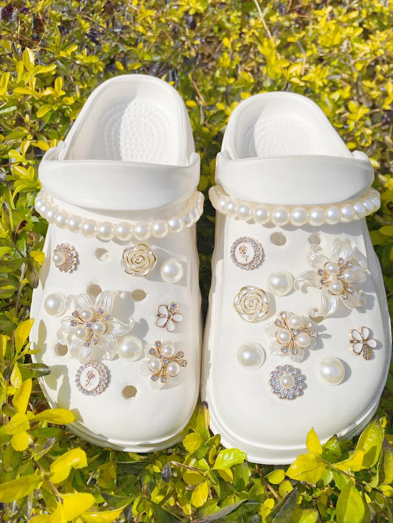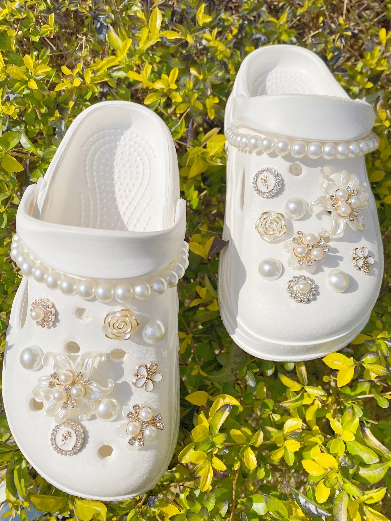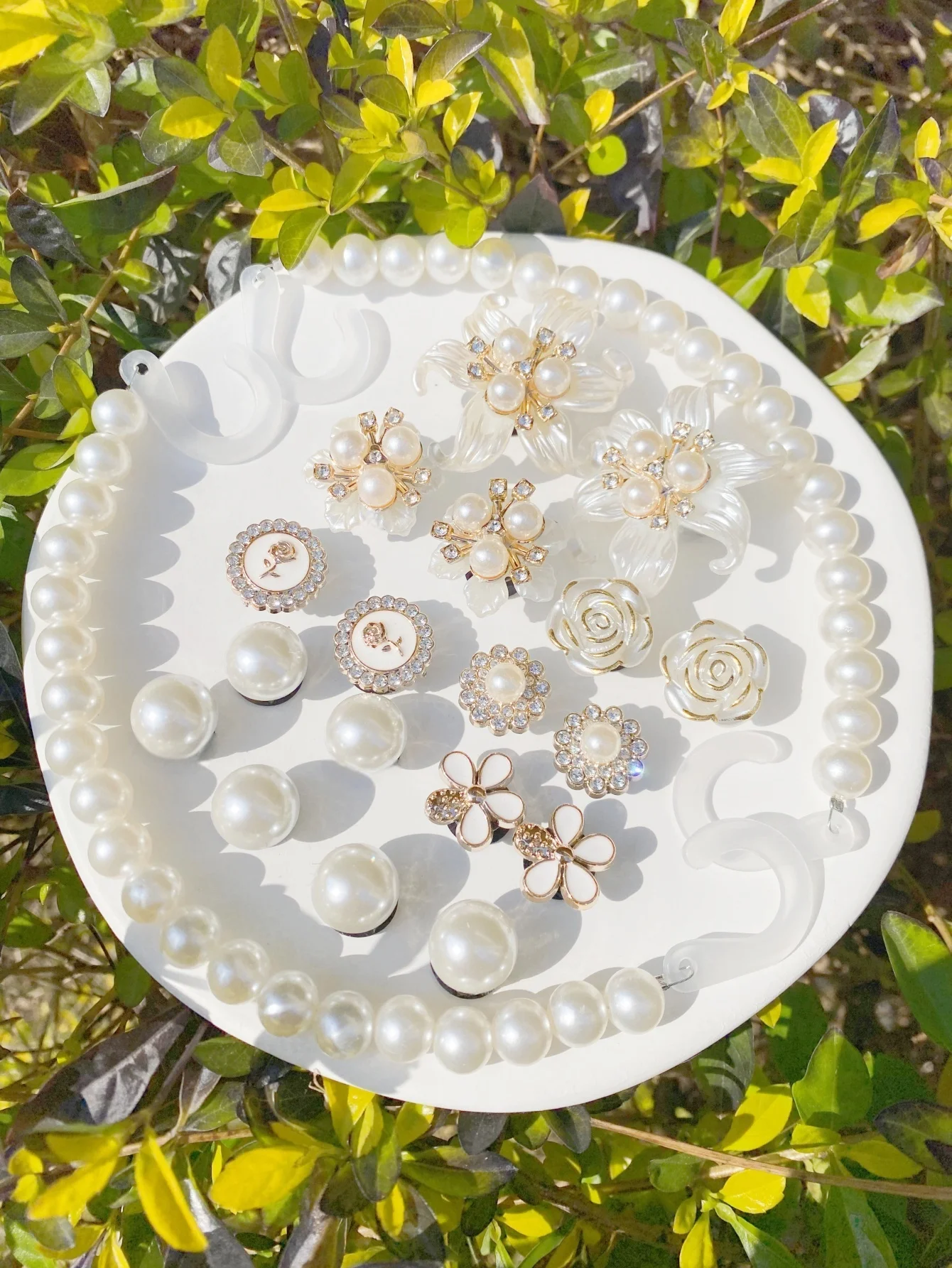 Este kit de acessórios decorativos é perfeito para personalizar babuches, sandálias e bolsas infantis, trazendo um toque delicado e elegante com flores e pérolas.